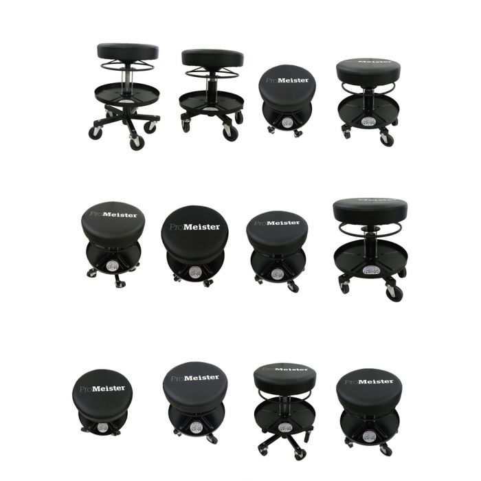 Oumbärlig i alla verkstäder, t e x vid fram- och bakvagnsarbeten, rekonditionering och lackering. Kraftig stål/plåtkonstruktion med mjuk och bekväm sittdyna. Sätet justerbart i hjödled från 42 – 53 cm. Praktisk hylla under sitsen som kan roteras 360 grader. Tippstabil och smidig att förflytta genom 5 st 75 mm hjul. Max belastning: 150 kg.