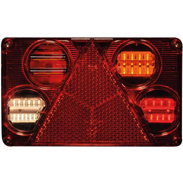 LED baklampa för trailer med sex funktioner uppdelade på höger respektive vänster lampa. Höger lykta fungerar som, bakljus, bromsljus, blinkers, nummerskyltsbelysning och backljus.