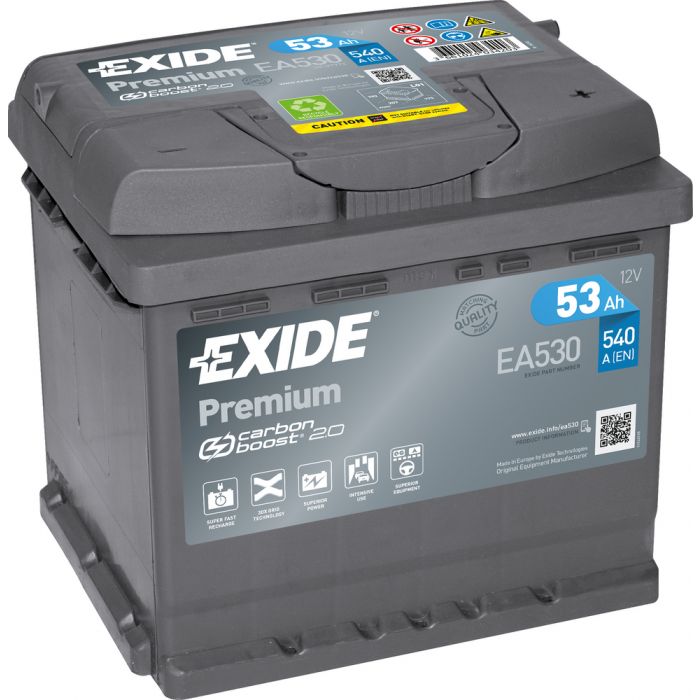 Detta kraftfulla Carbon Boost 2.0-batteri från Exide är ett premiumbatteri på 12V som mäter 190 x 207 x 157 mm. Fästklacken är B13/14 och batterikapaciteten är på 53Ah. Batteriet passar till ett flertal olika bilmodeller men vi rekommenderar att du sorterar i utbudet genom att använda vårt reg-sök innan du klickar igenom din beställning.