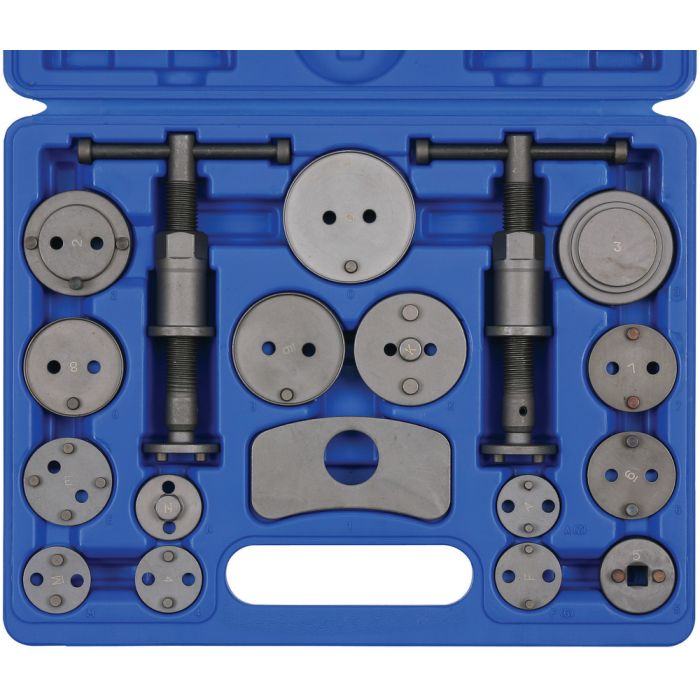 Sonic bromskolvsverktyg, höger & vänstergående. Returnerar bromskolvar utan att skada kolven eller gummidamasken. Sats med 18 delar. Innehåll: grundverktyg vänster, grundverktyg höger. Adapters för dom flesta moderna bilmmodeller samt tryckplatta