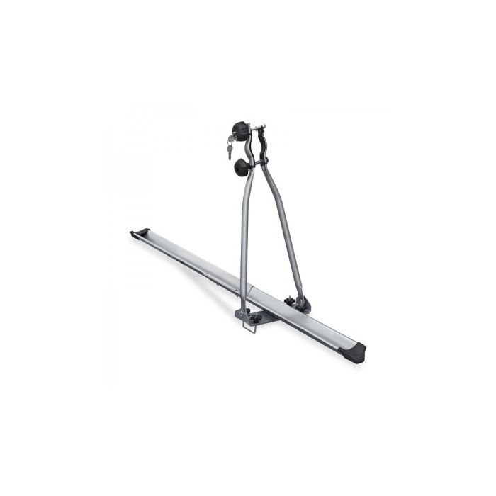 Takmonterad cykelhållare i stål. Stadig konstruktion med goda lastegenskaper (Max 15 kg). Passar takräcken med max-mått: 56 x 50 mm. Passar nästan alla cyklar. Självlåsande skruvar. Mjuka fästpunkter som skyddar ramen. TUV-godkänd. Färg silver