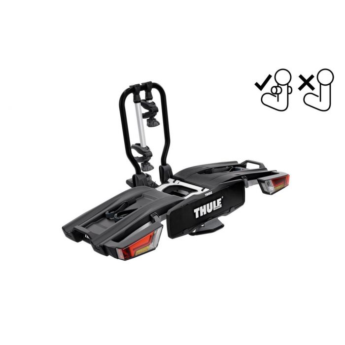 Den helt hopvikbara, kompakta cykelhållaren för dragkroksmontering som är lätt att använda och avsedd för en FIX4BIKE-dragkrok. Hållaren kan vikas ihop helt, vilket gör den praktisk att montera, hantera och förvara. Tack vare den höga lastkapaciteten går det även att transportera elcyklar och tunga mountainbikes. Enkel lastning av cyklar tack vare löstagbara cykelarmar med låsbara momentbegränsande Thule AcuTight-vred som klickar när det optimala vridmomentet har uppnåtts. Det stora avståndet mellan hjulhållarna gör det möjligt att transportera robusta cyklar med lång hjulbas. Justerbara pumpspännen med extra långa hjulremmar gör det enkelt att fästa fatbikehjulen (hjul på upp till 4.7 tum) vid transport. Den smarta fotmanövrerade tiltfunktionen gör bagageutrymmet lättåtkomligt. Ergonomisk transport av cykelhållaren med hjälp av de integrerade bärhandtagen. Förmonterad – inga verktyg behövs. Cyklarna kan låsas fast i hållaren, som i sin tur kan låsas fast i dragkroken (lås medföljer). Maximalt antal cyklar 2. Maximal cykelvikt 30 kg. Mått 63 x 123 x 68 cm. Mått hopfälld 63 x 31 x 68 cm. Passar ramdiametrar 22–80 mm. Maximal hjulbredd 3" (With Thule XXL Fatbike Wheel Straps 4.7"). Maximal hjulstorlek (diameter) 29 in. Maximal hjulbas 1300 mm. Löstagbara ramhållare Ja. Avstånd mellan cyklarna 22 cm. Kompatibel med kolfiberram Ja, adapter krävs: Thule Carbon Frame Protector. Montering av hjul på justerbara hållare Pump buckles. Nedfällbar (med monterade cyklar) Ja. Passar bilar med utanpåliggande bakre reservhjul Nej. Baklyktor Ja. Kompatibel med One Key System Ja. Låsbar – cykel till cykelhållare Ja. Låsbar - hållare till bil Ja.