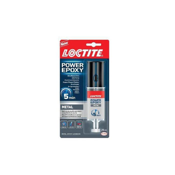 Epoxylim Power Epoxy Metal Loctite. Limmar och reparerar snabbt de flesta metaller som stål, aluminium, gjutgods, koppar etc. Lämpligt för snabb lagning av läckor i ledningsrör och metalltankar. Limmar även andra material som sten, marmor, glas etc. Limfogen motstår av vatten, olja, bensin, utspädda syror och svaga basiska kemikalier. Power Epoxy Metal tål värme upp till +150°C. Starkt - max 160 kg/cm² draghållfasthet. Snabbt - kan belastas efter 10 minuter. Fullständig styrka uppnås efter ca 24 timmar. Metallfärgat - ger gråa metallfärgade fogar.