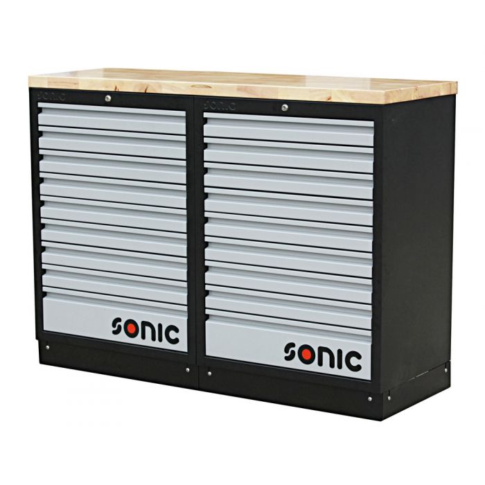 Sonic förvaringssystem "Modular Storage System", MSS i modern design. Innehåll: 2 lådhurtsar. Tillverkat av kraftig stålplåt och aluminiumprofiler. Bänkskivan är tillverkad av massivt trä. Modulsystemet kan placeras fritt och behöver ingen förankring i tex vägg. Lådhurtsens lådor kompatibla med Sonic TTS & SFS verktygssatser