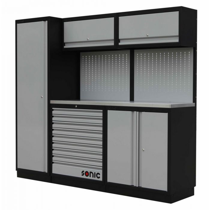 Sonic förvaringssystem "Modular Storage System", MSS i modern design. En bredare variant av 2371-4730196 Innehåll: 1 helskåp, 1 halvskåp, 2 överskåp och 1 lådhurts. Verktygsplåt i bänkens bakkant samt baksida för hängförvaring. Bänksskiva klädd med rostfri plåt. Tillverkat av kraftig stålplåt och aluminiumprofiler. Modulsystemet kan placeras fritt och behöver ingen förankring i tex vägg. Lådhurtsens lådor kompatibla med Sonic TTS & SFS verktygssatser