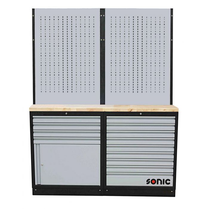 Sonic förvaringssystem "Modular Storage System", MSS i modern design. Innehåll: 1 lådhurts och 1 lådhurts med halvskåp. Tillverkat av kraftig stålplåt och aluminiumprofiler. Bänkskivan är tillverkad av massivt trä. Modulsystemet kan placeras fritt och behöver ingen förankring i tex vägg. Lådhurtsens lådor kompatibla med Sonic TTS & SFS verktygssatser