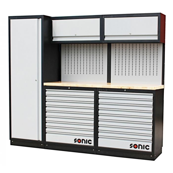 Sonic förvaringssystem "Modular Storage System", MSS i modern design. Innehåll: 1 högskåp, 2 lådhurtsar och 2 överskåp. Verktygspanel i bänkens bakkant för hängförvaring. Tillverkat av kraftig stålplåt och aluminiumprofiler. Bänkskiva av massivt trä. Modulsystemet kan placeras fritt och behöver ingen förankring i tex vägg. Lådhurtsens lådor kompatibla med Sonic TTS & SFS verktygssatser