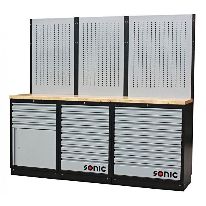 Sonic förvaringssystem "Modular Storage System", MSS i modern design. Innehåll: 2 lådhurtsar och 1 lådhurts med halvskåp. Verktygspanel i bänkens bakkant för hängförvaring. Tillverkat av kraftig stålplåt och aluminiumprofiler. Bänkskivan är tillverkad av massivt trä. Modulsystemet kan placeras fritt och behöver ingen förankring i tex vägg. Lådhurtsens lådor kompatibla med Sonic TTS & SFS verktygssatser
