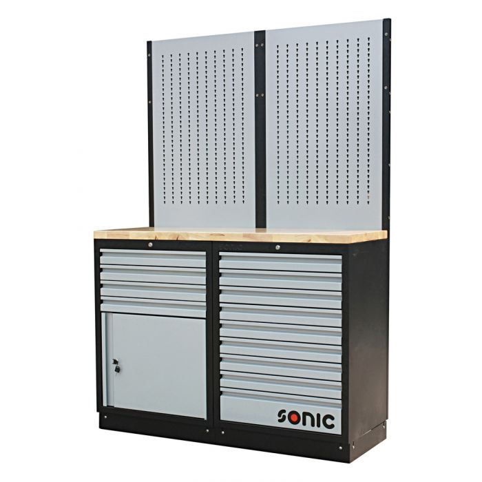 Sonic förvaringssystem "Modular Storage System", MSS i modern design. Innehåll: 1 lådhurts och 1 lådhurts med halvskåp. Verktygspanel i bänkens bakkant för hängförvaring. Tillverkat av kraftig stålplåt och aluminiumprofiler. Bänkskivan är tillverkad av massivt trä. Modulsystemet kan placeras fritt och behöver ingen förankring i tex vägg. Lådhurtsens lådor kompatibla med Sonic TTS & SFS verktygssatser