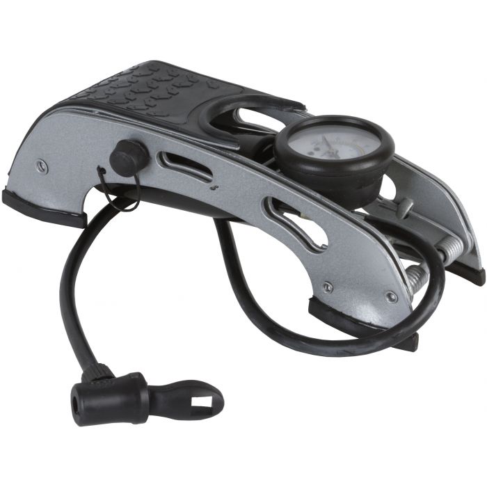Fotpump med manometer, slang, standard- och specialadapter. För bilar, motorcyklar och cykeldäck. Längd cylindrar: 120 mm Diameter på cylindrar: 54 mm Max 7 bar