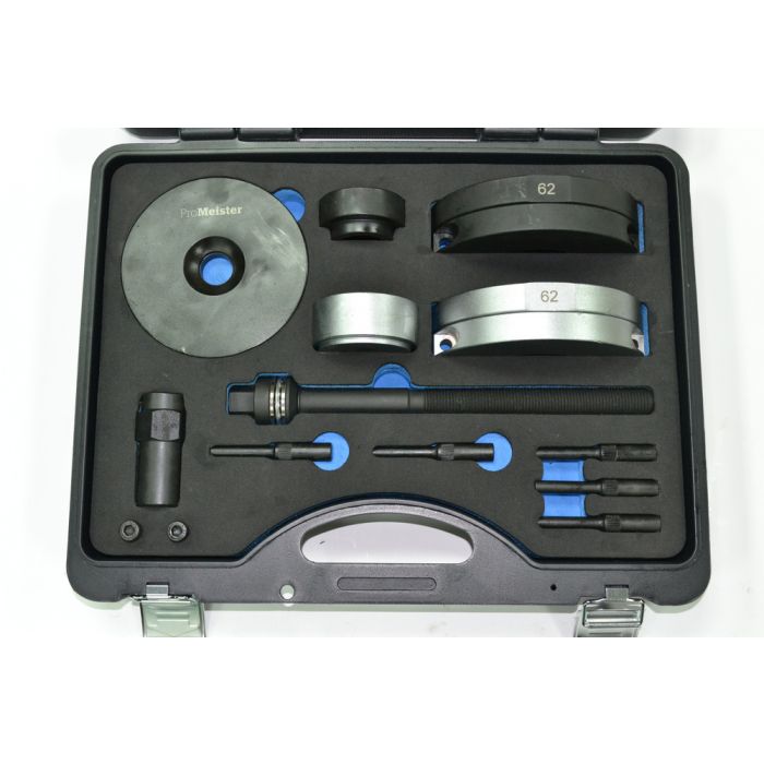 För lager med 62 mm diameter. Framtaget för att passa främst VAG. Verktygets unika design belastar lagret med jämnt tryck vilket förhindrar skador vid monteringen. Satserna levereras i stabil plastlåda. OBS! Se till att spindeln alltid är rejält infettad med molybdenfett.