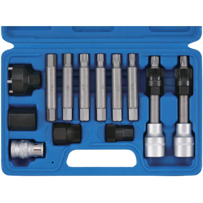 Sonic generatorverktyg, sats 13 delar. Innehåll: Kombinationshylsor Torx T50x113 mm & RIBE M10x113 mm. 2-tandade hylsor: 15 mm insex med 33 tänder & 22 mm insex med 33 tänder. 22 mm. 22 mm 1/2" 6-kanthylsa. 35 mm 1/2" rundhylsa. 1/2" fyrkanthylsa hona x 10 mm insex. Insex bits adaptor. Bits 75 mm: Insex 6-10 mm, Torx T40-T50. RIBE M8-M10. H8-H10. Passsar bl a till förljande bilmärden: VW, Audi, SEAT, Mercedes, Renault, BMW, FIAT