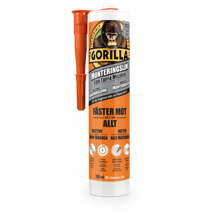 Monteringslim för tuffa miljöer Gorilla monteringslim är så mångsidigt att det greppar i stort sett allt. Kan användas till Byggskivor, Badrumsarbeten, Kök, Listarbete, Stenarbeten, Paneler, Golvläggning, Trädäck med mera Formulan fäster till 100 % och skapar ett slitstarkt fäste som håller länge. Det är flexibelt, fyller ut hål och motstår extrema temperaturer. Använd inomhus och utomhus, till och med under vatten – fäster mot både våta och torra ytor. Det ger ett extra starkt fäste som varar. Övermålningsbar efter genomhärdning.