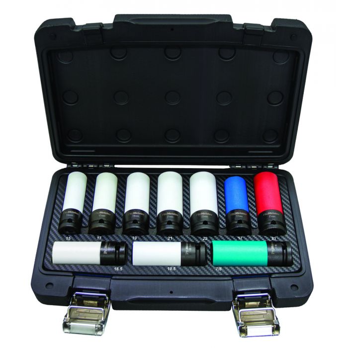 En sats som innehåller hylsor för de flesta förekommande storlekarna på hjulbultar, inklusive Tesla, MB och Hyundai. - 15, 17, 19, 21 och 22 mm - 18.5 och 19.5 för hjulbultar med dekorhylsa - 7/8" Tesla - 17 mm Mercedes Benz - 21 mm Hyundai och KIA