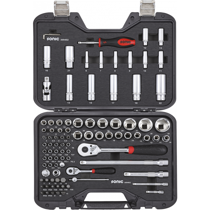 • Inkluderar både 1/4" och 1/2" hylssnycklar
