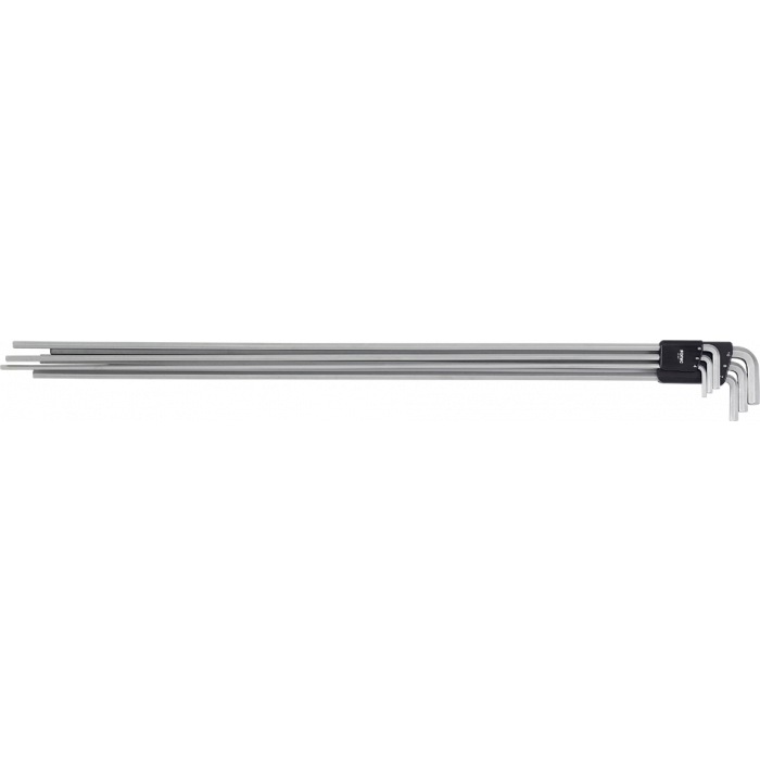 L-nycklar HEX som är extra långa, 600 mm. Innehåller storlekarna 4, 5, 6, 7, 8 och 10 mm. Sitter monterade på en praktisk hållare som är tydligt märkt.