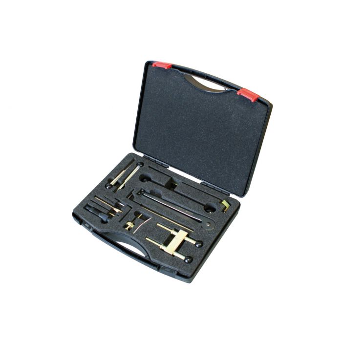 Låsverktyg för kamremsaxlar. OBS: ”Endast för att låsning av kamremsdreven. I satsen ingår inte verktyg för låsning av dreven till kamkedjan”. Passar VW-Audi 1.4 16V, 1.4 FSI, 1.6, 1.6 16V, 1.6 FSI, 1.8 Turbo, 1.8 Turbo 20V, 2.0, 2.0 16V, 2.0 FSI / TFSI, 2.4, 2.7 Turbo och 2.8 Bensinmotorer. För att låsa/positionera motoraxlar som kamaxlar, samt justering av kamremspännaren vid byte av kamrem eller andra motorreparationer