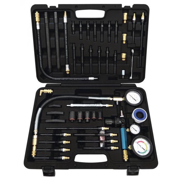 Uppgraderad sats för att testa kompressionen på diesel och bensinmotorer. Innehåller de 17 vanligaste glödstiftsadapters som täcker 29 glödstiftstyper från 33 tillverkare och 500 motortyper. Innehåller även insprutnings- adapters. Passar bl a till: Alfa Romeo, Audi, BMW, Cadillac, Chrysler, Citroen, Dacia , Dodge, Fiat, Ford, Honda, Jaguar, Jeep, Lancia, Land Rover, Mazda, Mercedes, MG, Mini, Mitsubishi, Nissan, Peugeot, Porsche, Renault, Rover, Saab, Skoda, Suzuki, Toyota, Vauxhall / Opel , Volvo, VW. Kapacitet: 0-70 bar (0-1000 psi)