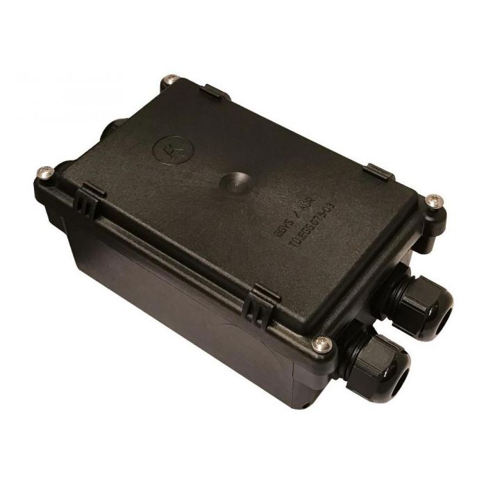 Plastbox (material PA 6 GF30) i vattentätt utförande. Storlek 158 x 99 mm. Höjd 63 mm. Metriska anslutningar med monterade PG-anslutningar. Bestyckad med kopplingsplint med 8 x 4 pol. + 6 x 8 pol. Tätningsklass IP69K. ADR-godkänd.