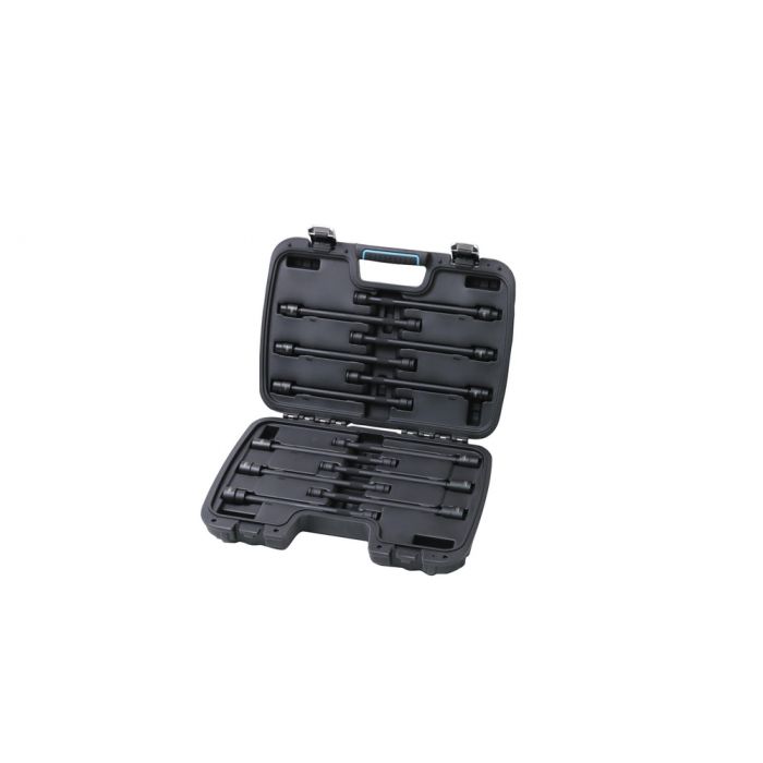 Krafthylssats 3/8" med extra långa förlängare, 12 delar. Hylsorna sitter fast monterade med kulled på förlängarna för att undvika att hylsan lossnar på olämpligt ställe. Innehåll: 8 - 19 mm Längd: 230 mm.