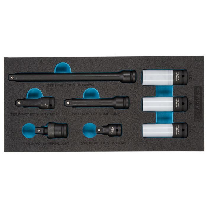 Innehåll Storlek Hjulbultshylsor: 17, 19, 21mm Tillbehör: Förlängare 50, 75, 150, 250mm Universalknut