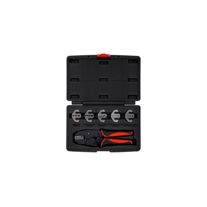 Sonic krimptång med spärrfunktion och utväxling för hög kraft. 6 snabbt utbytbara käftar ingår. Klarar att krimpa isolerade kabelskor och skarvar från 0.5-6 mm2. Oisolerade samt öppna kabelskor och skarvar från 1.5-10 mm2. Käftarna är tillverkade av AISI 4140 legering, och ytbehandlade med zink-fosfat. Handtag av tvåkomponents plast för god ergonomi Käft 1: AWG 22-18/16-14/1-10. DIN 0.5-1.0/1.5-2.5/4-6mm2 Käft 2: AWG 20-18/16-14/12-10/8. DIN 1.5/2.5/6/10mm2. JIS 1.25/2/5.5/8 mm2 Käft 3: AWG 20-18/16-14/12-10. DIN 0.5-1.0/1.5-2.5/4-6 mm2 Käft 4: AWG 22/20/18/16/14/12. DIN 0.5/0.75/1.0/1.5/2.5/4.0 mm2 Käft 5: AWG 10/8/6. DIN 6/10/16mm2 Käft 6: AWG 14/22/8. DIN 2.5/0.5/8-10 mm2