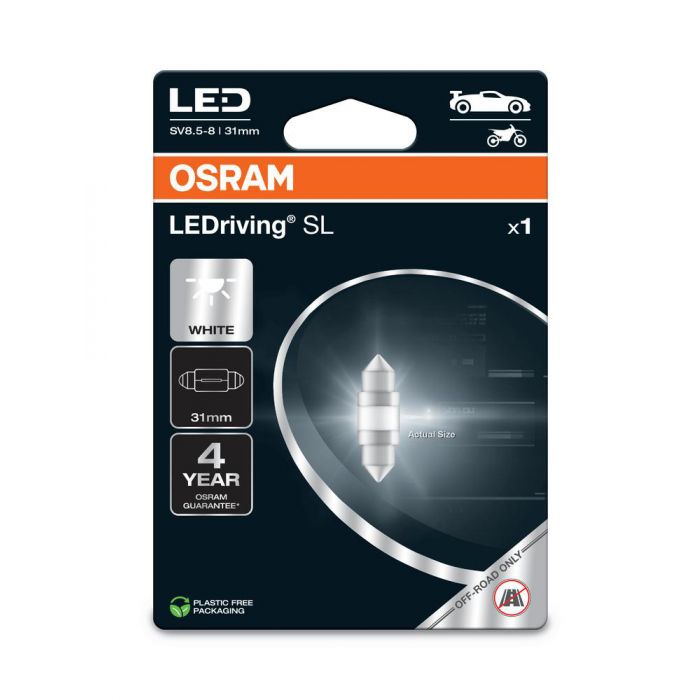 LEDriving SL C5W-ersättningslampor erbjuder ett modernt och intensivt ljus med en färgtemperatur på upp till 6 000 kelvin. Dessa ersättningslampor passar alla konventionella C5W-lampsocklar. Jämfört med vanliga lampor förbrukar dessa LED-ersättningslampor upp till 80 % mindre energi. OSRAM lämnar 4 års garanti på dessa LEDriving SL-lampor. Dessa produkter är inte ECE-godkända och får inte användas på allmänna vägar i utvändiga tillämpningar.