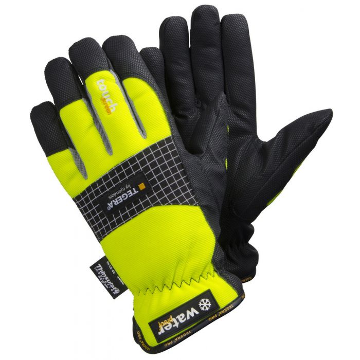 TEGERA 9128 PRO, Ergonomisk, vattentät handske i Microthan+® med touchscreen-funktion. Thinsulate™ och invändig fleece håller kvar kroppsvärmen. Slitstarkt Microthan®+ syntetläder. Bra grepp på hala ytor tack vare diamant greppmönster. Ovanhand i gul varselfärg ger extra skydd under mörka förhållanden. Manchett med 360° resår för bättre passform EN 388:2016, 1121X EN 511:2006, 111