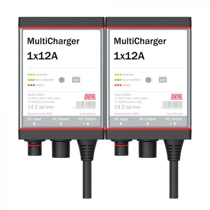 DEFA MultiCharger 2x12A batteriladdare är avsedd för fast installation och är lämplig förbatteristorlekar upp till 2x150Ah. Laddaren är felpolariserings- och kortslutningssäker. Kan användas på alla typer av bly-/ syrabatterier (AGM, Gel och fritt ventilerade). Den passar batteristorlekar upp tilll ca 2x150Ah och kan underhållsladda batteriet under obegränsad tid. Användning: Laddarna klarar parallell belastning upp till 6A från annan förbrukare samtidig som den laddar. Laddningsspänningen är temperaturkompenserad med extern sensor. Laddaren kan även anslutas display för fjärravläsning av laddningscykel. LED Grön blink – Laddning. Fast Grönt ljus – Full-laddat Röd Blink - Fel