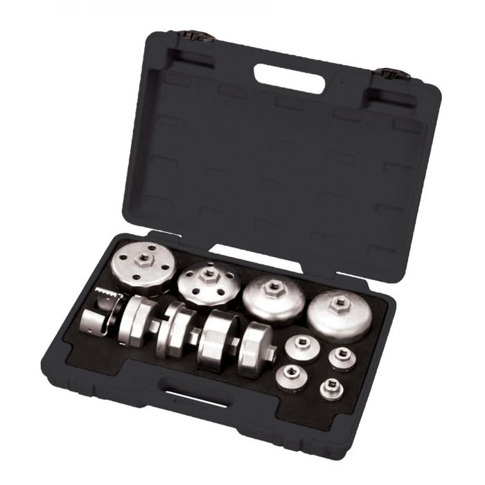 Oljefilterverktyg, 13 delar. Oljefilterkoppar av gjuten aluminium. Passar bl a VAG, Ford, MB, Porsche, Hyundai, KIA, Lexus, Toyota & Mazda. Storlekar från 24 - 100 mm, varav en är ställbar från 63 – 83 mm. Fattning: 3/8”.