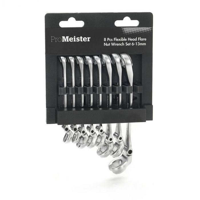 Öppen ringnyckel, Flex-Head, sats 8 delar. Dimensioner: 6 – 13 mm. 6-kant fattning. Fast nyckel och ”kråkfot” i samma nyckel. Speciellt bra vid arbete på hydraulslangar, broms- & bränsleledningar & air-condition. Flexibelt, ledat huvud som kan vinklas upp till 230 grader. Tillverkad av högkvalitativt Chrome Vanadiumstål. Mattchromaterad ytfinish. Ergonomisk design, inga skarpa kanter