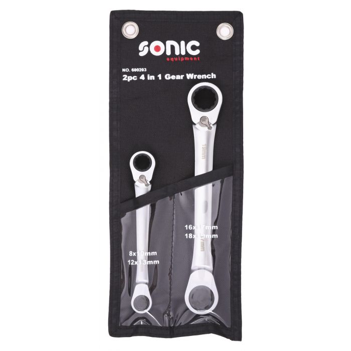 Sonic ringspärrnyckel med 4 dimensioner med ringspärrfunktion i en nyckel. Innehåller 2 nycklar som klarar dimensionerna 8, 10, 12, 13 mm och 16, 17, 18, 19 mm. Förvaras i praktiskt rulletui.