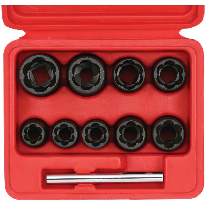 Sonic bult/mutterutdragare för skadade bultar och muttrar. Hylsorna skruvas fast motsols och den skärande funktionen ger ett fast grepp. Innehåll: 10, 11, 12, 13, 14, 15, 16, 17 & 19 mm. Tillverkade av Chrome Molybden stål med svartoxiderad ytfinish