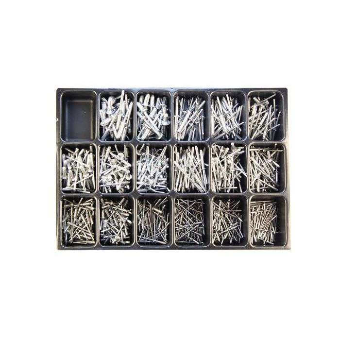 Sortimentinsatsen består av 725 delar enligt nedan: 1st 7600018 SORTIMENTINSATS 18-FACK 50st 4230209 POPNIT 2.4-9.3 50st 42306 POPNIT 3.2-6.1 50st 42309 POPNIT 3.2-9.7 50st 42312 POPNIT 3,2-12 50st 42408 POPNIT 4-8.5 50st 42410 POPNIT 4-10,3 50st 42414 POPNIT 4-13,9 50st 42418 POPNIT 4-18 50st 42424 POPNIT 4-24.5 50st 42510 POPNIT 4,8-9,2 50st 42513 POPNIT 4,8-12,7 50st 42517 POPNIT 4,8-16,5 25st 42519 POPNIT 4,8-19 25st 42525 POPNIT 4,8-25,4 25st 42532 POPNIT 4,8-32 25st 42613 POPNIT 6,4-12,7 25st 42619 POPNIT 6,4-19,5