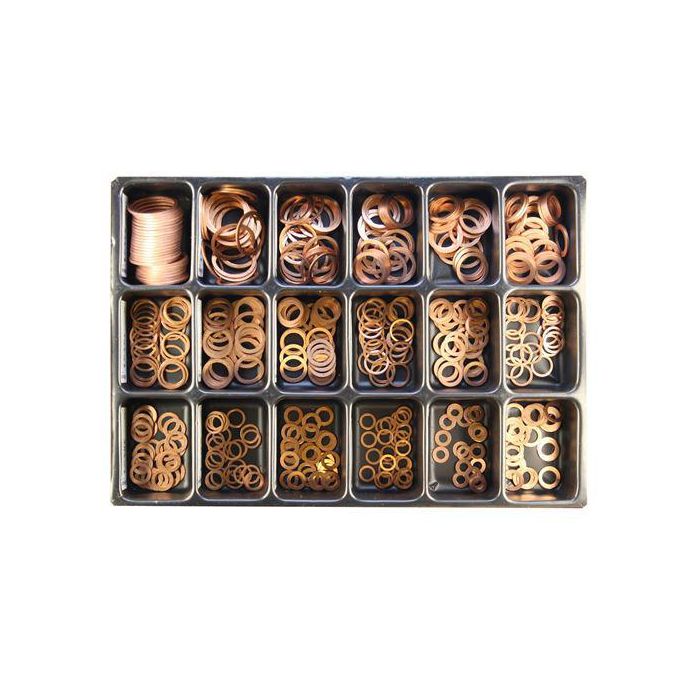 Sortimentinsatsen består av 450 delar enligt nedan: 1st 7600018 SORTIMENTINSATS 18-FACK 25st 450400610 CU-BRICKA 6-10-1mm 25st 4504006 CU-BRICKA 6-12-1mm 25st 450400812 CU-BRICKA 8-12-1mm 25st 4504008 CU-BRICKA 8-14-1mm 25st 450401014 CU-BRICKA 10-14-1mm 25st 4504010 CU-BRICKA 10-16-1mm 25st 450301216 CU-BRICKA 12-16-1.5mm 25st 4503012 CU-BRICKA 12-18-1.5mm 25st 450301418 CU-BRICKA 14-18-1.5mm 25st 4503014 CU-BRICKA 14-20-1.5mm 25st 4503016 CU-BRICKA 16-22-1.5mm 25st 450301620 CU-BRICKA 16-20-1.5mm 25st 450421624 CU-BRICKA 16-24-2mm 25st 4503018 CU-BRICKA 18-24-1.5mm 25st 4503020 CU-BRICKA 20-26-1.5mm 25st 450302227 CU-BRICKA 22-27-1.5mm 25st 4503026 CU-BRICKA 26-32-1.5mm 25st 450423036 CU-BRICKA 30-36-2mm