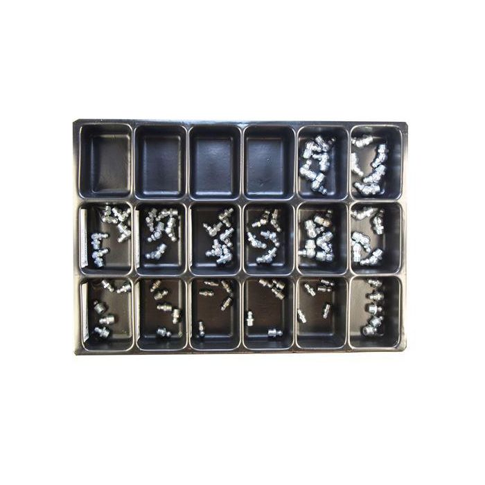 Sortimentinsatsen består av 70 delar enligt nedan: 1st 7600018 SORTIMENTINSATS 18-FACK 5st 10206 SMÖRJNIPPEL RAK KR 1/8 5st 10406 SMÖRJNIPPEL RAK INSL.6 H 5st 10408 SMÖRJNIPPEL RAK INSL.8 H 5st 106061 SMÖRJNIPPEL RAK M6X1 5st 106081 SMÖRJNIPPEL RAK M8X1 5st 106101 SMÖRJNIPPEL RAK M10X1 5st 10206045 SMÖRJNIPPEL 45GR KR 1/8 5st 10206090 SMÖRJNIPPEL 90GR KR 1/8 5st 10606145 SMÖRJNIPPEL 45GR M6X1 5st 10606190 SMÖRJNIPPEL 90GR M6X1 5st 106081045 SMÖRJNIPPEL 45GR M8X1 5st 106081090 SMÖRJNIPPEL 90GR M8X1 5st 10610145 SMÖRJNIPPEL 45GR.M10X1 5st 10610190 SMÖRJNIPPEL 90GR M10X1