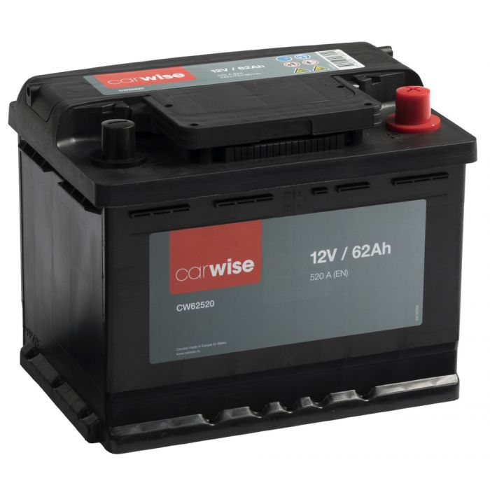 Detta prisvärda startbatteri från Carwise är på 12V och mäter 190 x 242 x 175 mm. Fästklacken är en B13 och batterikapaciteten är på 62Ah.