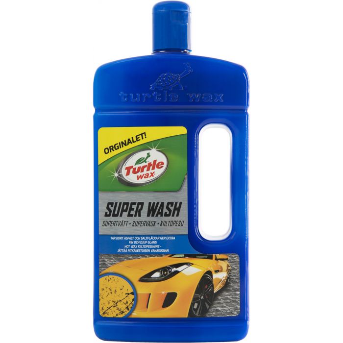 Klarar den svåraste smuts och ger överlägsen glans. Avlägsnar effektivt salt, asfalt, sot, smuts m m. Innehåller äkta Turtle Wax. PRODUKTEGENSKAPER: 1. Spola bilen ordentligt så att lös smuts avlägsnas. 2. Blöt en tvättsvamp i ljummet vatten. 3. Häll 'en skvätt' Supertvätt direkt på svampen. Tvätta en begränsad yta. 4. Spola av den tvättade delen innan medlet har torkat.