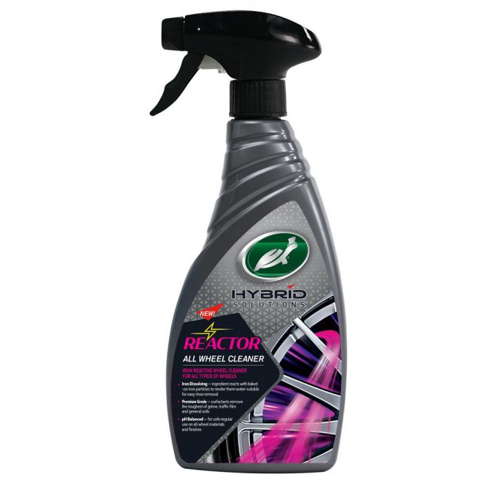 HYBRID SOLUTIONS RAPID REACTION WHEEL CLEANER passar till alla typer av fälgar. Järnlösande ämnen reagerar med bromsdammpartiklarna så att det blir enkelt att skölja av. En snabb färgskiftning visar att medlet verkar och talar om när fälgen är redo för mekanisk rengöring innan avsköljning. Doftblockerare döljer obehaglig lukt i medlet.